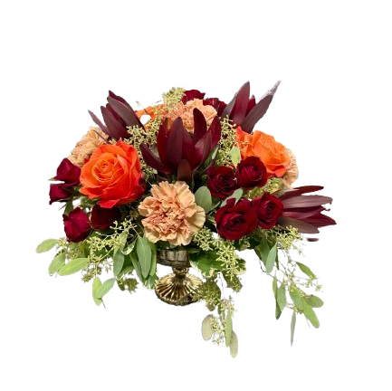 Send them our elegant Autumn's Embrace centerpiece. A fresh mixture of rich fall colored flowers presented in a keepsake mercury glass footed pedastal vase that will bring autumn luxury to their table. Exact colors of container and flowers will vary. Note: Some flowers and other products pictured are subject to availability, and may be substituted for a similar item if unavailable. Standard Size 12" Tall X 16" Wide