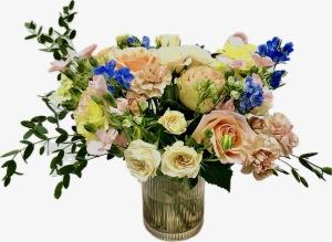 A gorgeous mix of pastel blooms including roses, spray roses, delphinium, dianthus, ranunculus, and carnations. Note: Some flowers and other products pictured are subject to availability, and may be substituted for a similar item if unavailable.