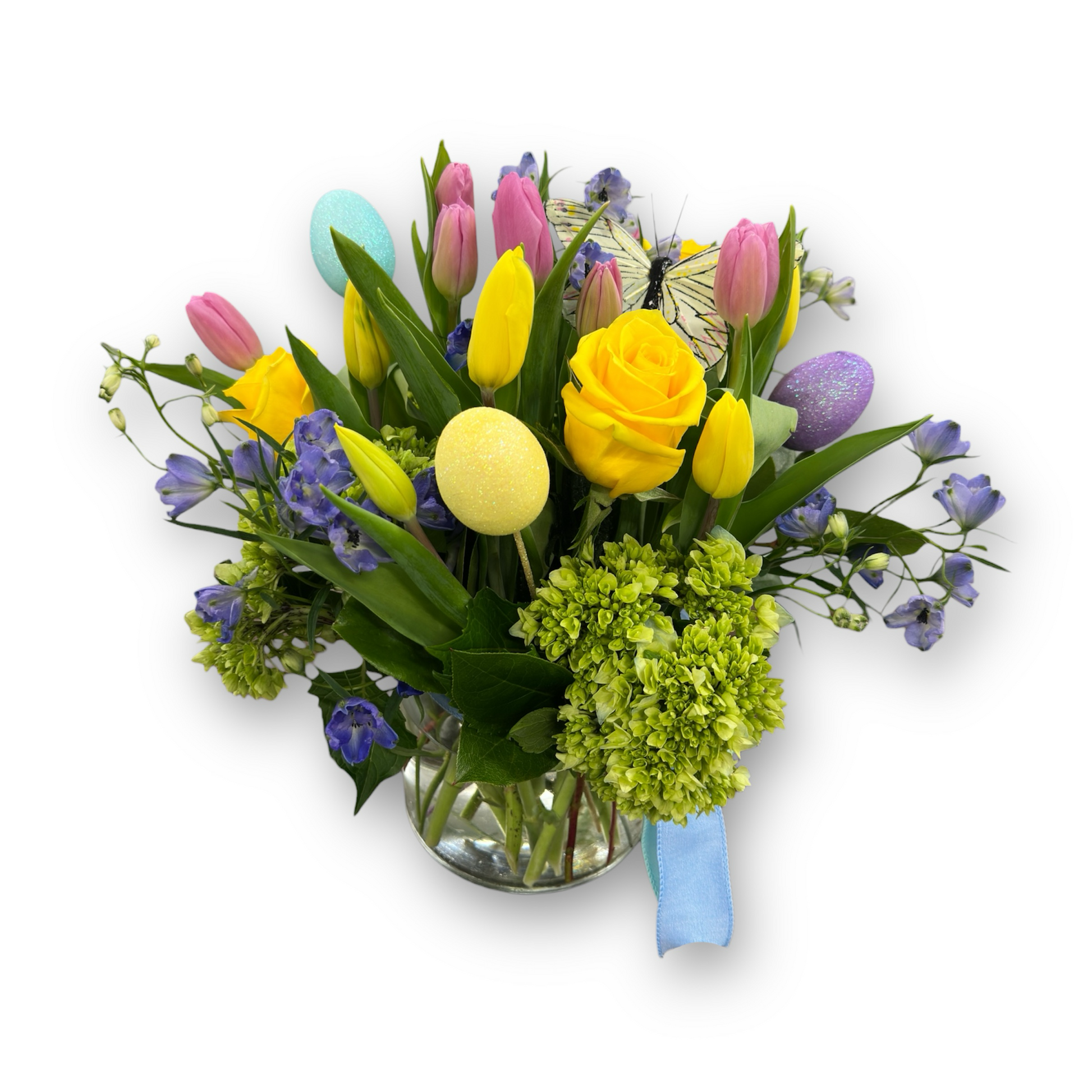 This fresh arrangement is sure to evoke the memories of hunting for easter eggs among the gorgeous pastel blooms of spring including tulips, hydrangea, roses, and delphinium. Note: Some flowers and other products pictured are subject to availability, and may be substituted for a similar item if unavailable.