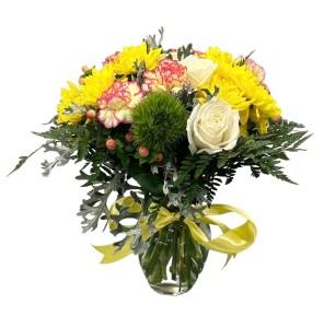 Bring sunshine indoors and exude a lively and joyful vibe. This arrangemnet is sure to capture the esscence of a fun day in the sun. Note: Some flowers and other products pictured are subject to availability, and may be substituted for a similar item if unavailable.