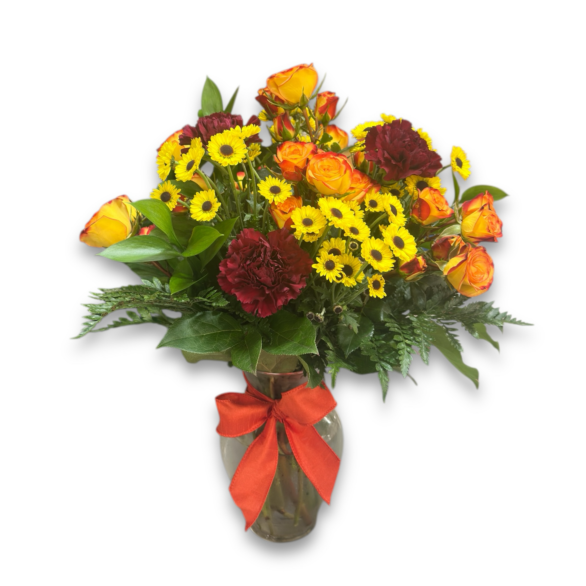 Send a bouquet that captures the warm and rich hues of the autumn season. A fresh mixture of shades of yellow, burgundy, red, and orange blooms mixed with lush greenery. Note: Some flowers and other products pictured are subject to availability, and may be substituted for a similar item if unavailable.