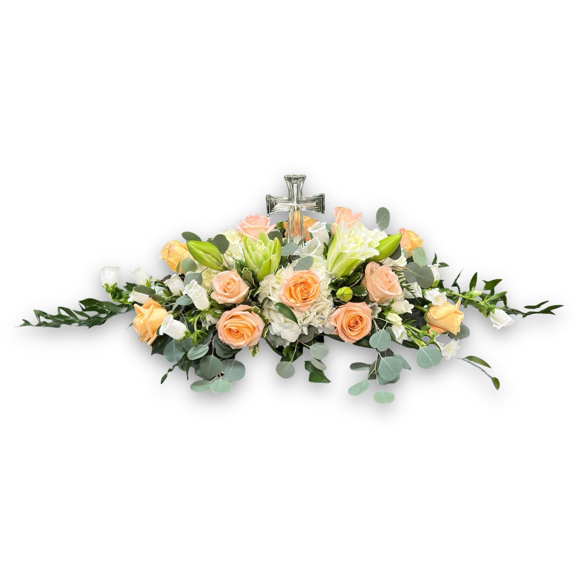 Remember your loved one with this soothing and respectful expression of sympathy, providing a gentle reminder of love and support during a difficult time. This serene and gentle arrangement is handcrafted in a slate colored rectangle dish with garden fresh peach and white flowers with premium greenery . Note: Some flowers and other products pictured are subject to availability, and may be substituted for a similar item if unavailable. Dimensions 10" tall X 30" long