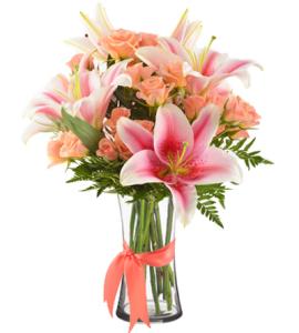 The Hugs & Kisses bouquet features fragrant Stargazer Lilies and Spray Roses arranged in a clear glass vase, tied with a complementing ribbon. Please note: Flowers and products shown are subject to availability and may be substituted if unavailable.