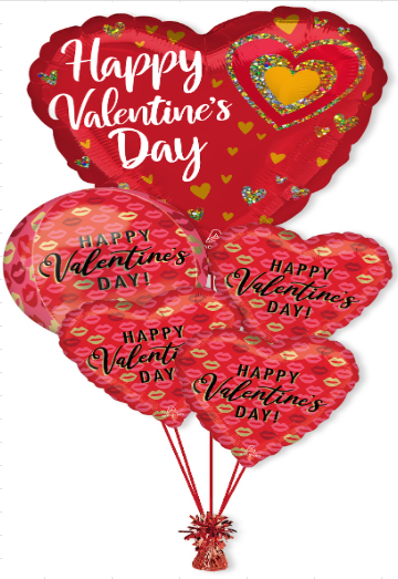 Show your love with this 5 pc Happy Valentines balloon bouquet featuring 1 jumbo shape, 1 bubble, and 3 18" Mylar balloons. Please note: Products shown are based on availability and may be substituted as close as possible when unavailable.