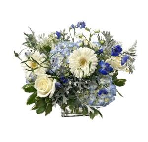 The Ocean Front flower arrangemnet featuring blue hydrangeas capture the serene and refreshing essence of the sea. Note: Some flowers and other products pictured are subject to availability, and may be substituted for a similar item if unavailable.
