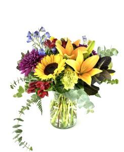 Our October Skies bouquet features Asiatic lilies, mni hydrangea, sunflowers, mums, delphinium, alstromeria and more. Please note: Some Flowers and other products shown are subject to availability, and may be substituted when unavailable.