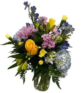 This elegant composition embodies a sense of peacfulness. Featuring: blue hydrangeas, yellow roses, and blue delphinium. Note: Some flowers and other products pictured are subject to availability, and may be substituted for a similar item if unavailable.