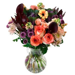 The Peachy Day bouquet is more than just peachy. A stunning bouquet featuring shades of peach, burgundy and purple. Make any ones day with this combination of roses, mini callas, spray roses, kale and more! Note: Some flowers and other products pictured are subject to availability, and may be substituted for a similar item if unavailable.