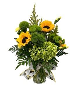 Reminiscent of a delicious picnic spread on a lush green lawn, this arrangment is perfect for any occasion. It features green hydrangeas and yellow sunflowers. Note: Some flowers and other products pictured are subject to availability, and may be substituted for a similar item if unavailable.