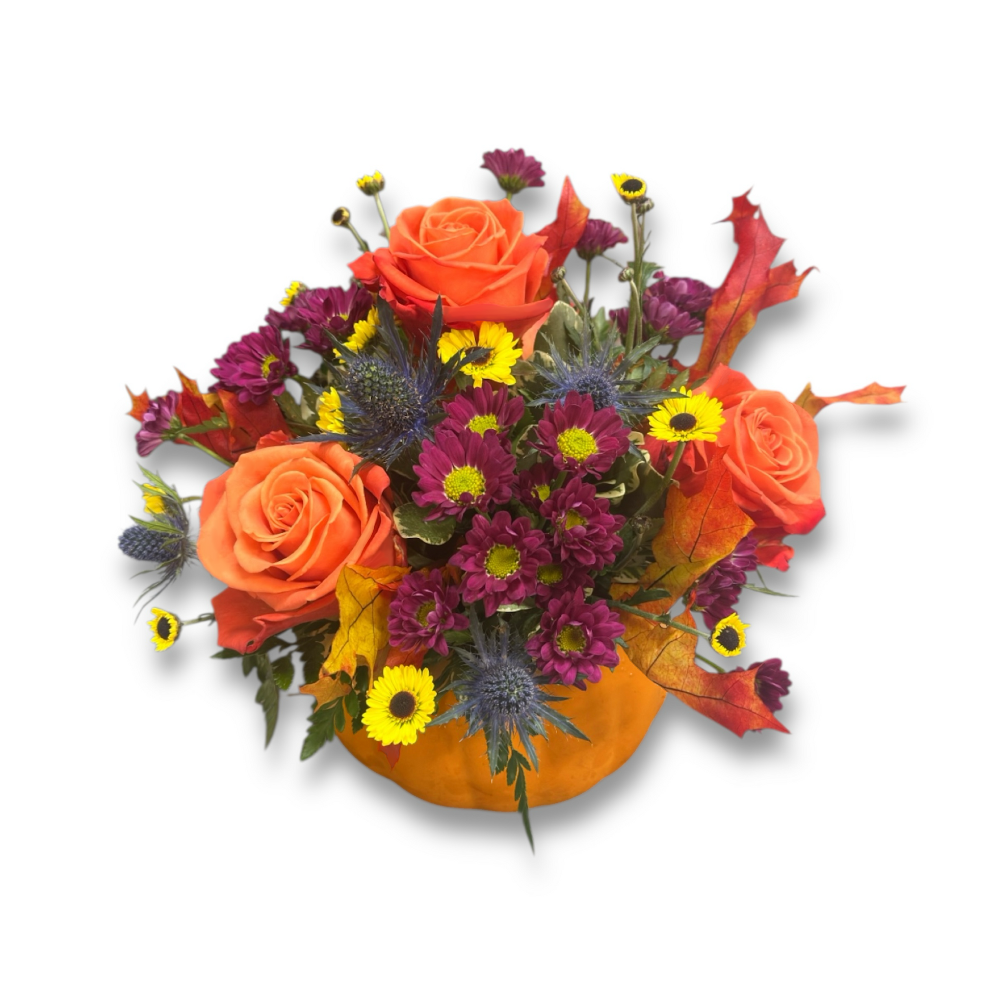Pumpkin patch pop is the perfect way to celebrate the fall season. A brightly colored whimsical fresh floral arrangment presented in a keepsake ceramic pumpkin that can be used year after year. Note: Some flowers and other products pictured are subject to availability, and may be substituted for a similar item if unavailable. Height 12" x 12" Width