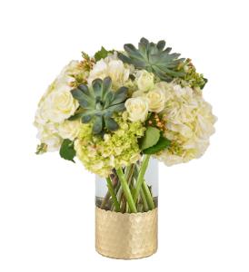 Our Pure Beauty bouquet features live Succulents nestled in White and Green Hydrangea, with White Spray Roses and waxflower arranged in a glass vase with gold band. Please note: All items and colors shown are subject to availability and may be substituted when unavailable.