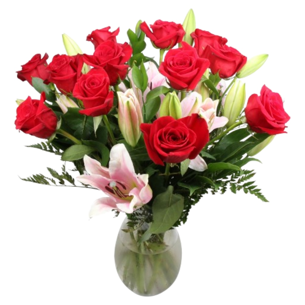 12 Roses thoughtfully arranged with stargazer lilies in a glass vase including an assortment of lush greenery. Note: Some flowers and other products pictured are subject to availability, and may be substituted for a similar item if unavailable.