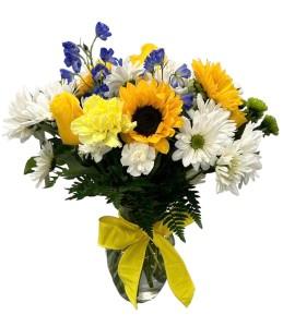 Brighten their day with this cheerful summer arrangement thoughtfully designed with sunflowers, daisies, roses, carnations, and delphinium. Note: Some flowers and other products pictured are subject to availability, and may be substituted for a similar item if unavailable.
