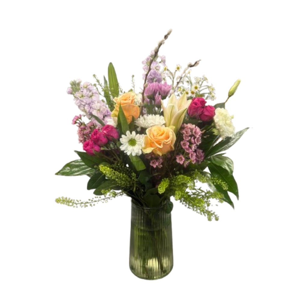 Capture the essence of Spring with this magnificent and fragrant collection of flowers and lush greens. This stunning arrangement features lilies, stock and roses mixed with a nice selection of seasonal fresh blooms. Please note: Products shown are based on availability and may be substituted as close as possible when unavailable.