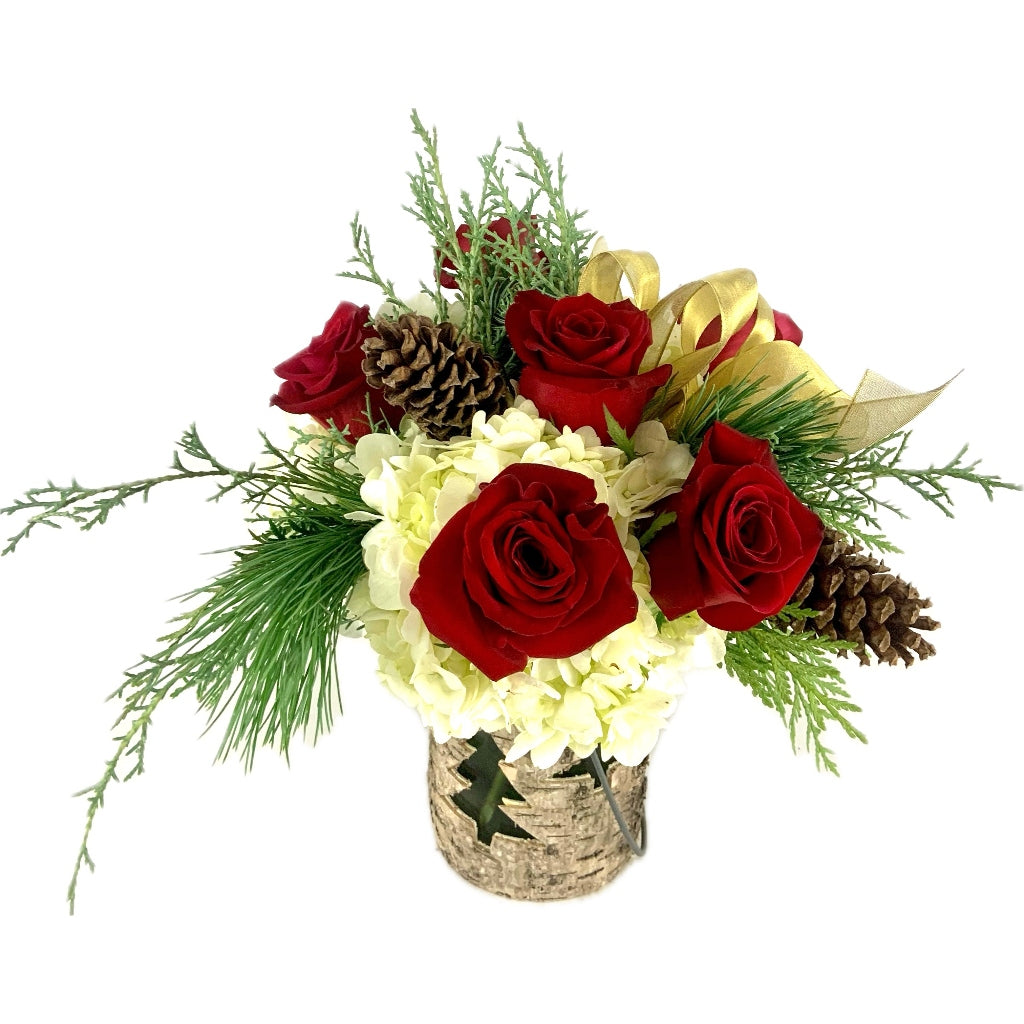 This rustic floral arrangement features red roses, white hydrangea, winter greens and pinecones. Note: Some Flowers and other products pictured are subject to availability, and may be substituted for a similar item if unavailable.